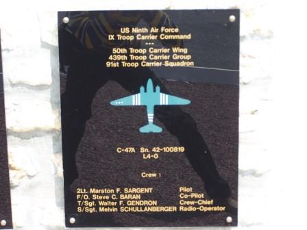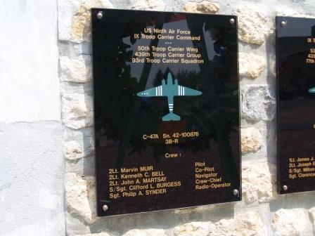A mini-replica of a C-47 overlooks a stone wall with six black plaques with gold lettering commemorating the air crews of the C-47s that crashed in the area while dropping paratroopers on D-Day. A glassed-in container holds one of the C-47's engines.