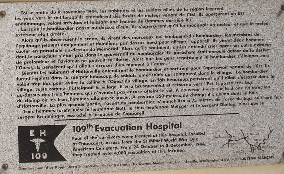 The memorial also references 1LT Richard Noble of the 452nd Bomber Group who was executed after attempting to escape along with a Canadian flyer on August 8, 1944 in Olizy-Primat, France. See site Olizy-Primat for more on this memorial and incident.