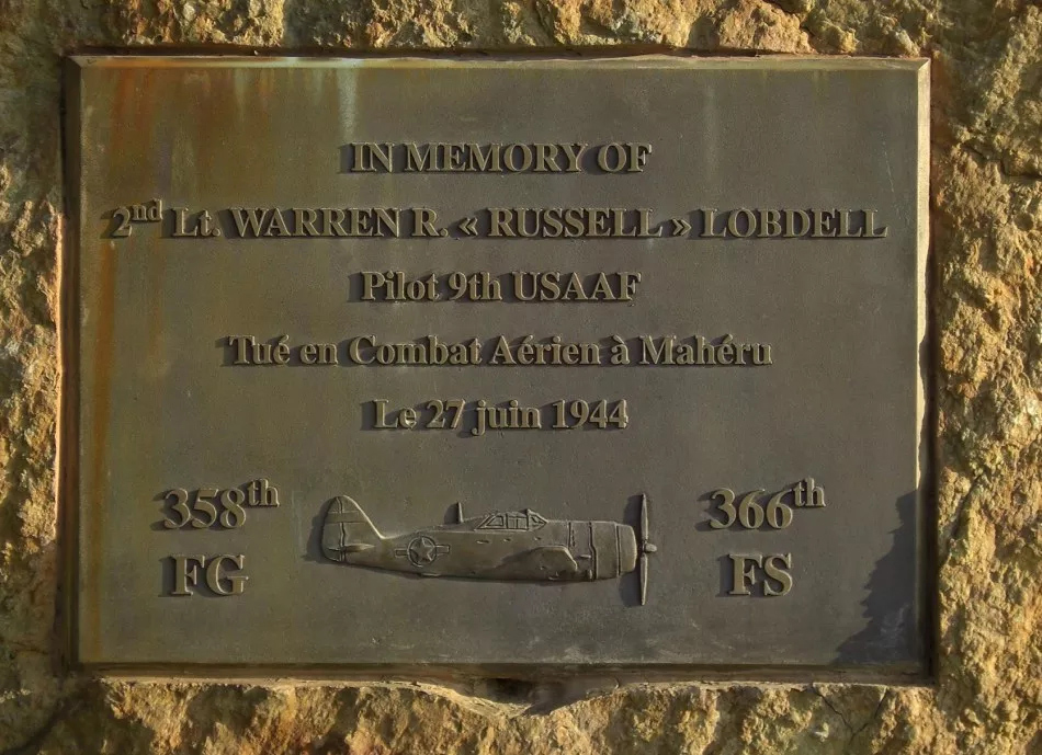A massive boulder bearing a weather-beaten inlaid plaque with an inscription commemorating Lt Lobdell who crashed in the area during WWII.