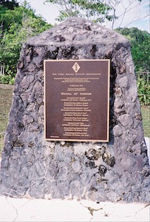 Located on the far side of the grass field. Monument This concrete stele with two large bronze plaques commemorates the men of the 1st Marine Division for their actions while taking the island of Peleliu. The division fought hard for two moths before the Island was captured, taking immensely heavy casualties in the process. The smaller of the two plaques recognizes eight men who were awarded the Medal of Honor for their actions on Peleliu.