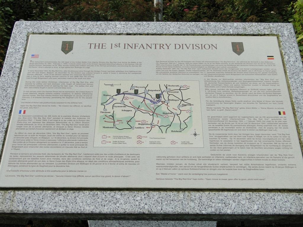 Pendant la semaine qui précéda Noël, des fantassins de la Big Red One, habilement aidés par des unités d'artillerie et de destroyers de tanks, repoussèrent les assauts déterminés de blindés allemands dont l’objectif était d’ouvrir la route principale. C’est avec acharnement que les batailles furent alors menées, par dans des conditions extrêmes de froid et de neige. A la mi-janvier quand la poussée allemande perdit de son élan, le Vème corps des Etats-Unis attaqua, en dépit des conditions atmosphériques extrêmes, pour détruire les forces allemandes qui se retiraient. La première Division prit Büllingen le 29 janvier et le 2 février et entra de nouveau en Allemagne, pénétrant la ligne de Siegfried pour la deuxième fois.