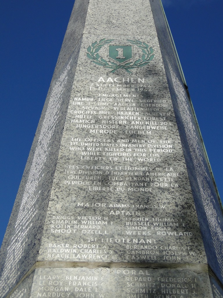 A tall grey granite obelisk commemorating by name all of the First Infantry Division soldiers killed while fighting in the area. The Memorial Commemorates the 1st Infantry Division’s 1223 dead between 7 September and 15 December 1944.