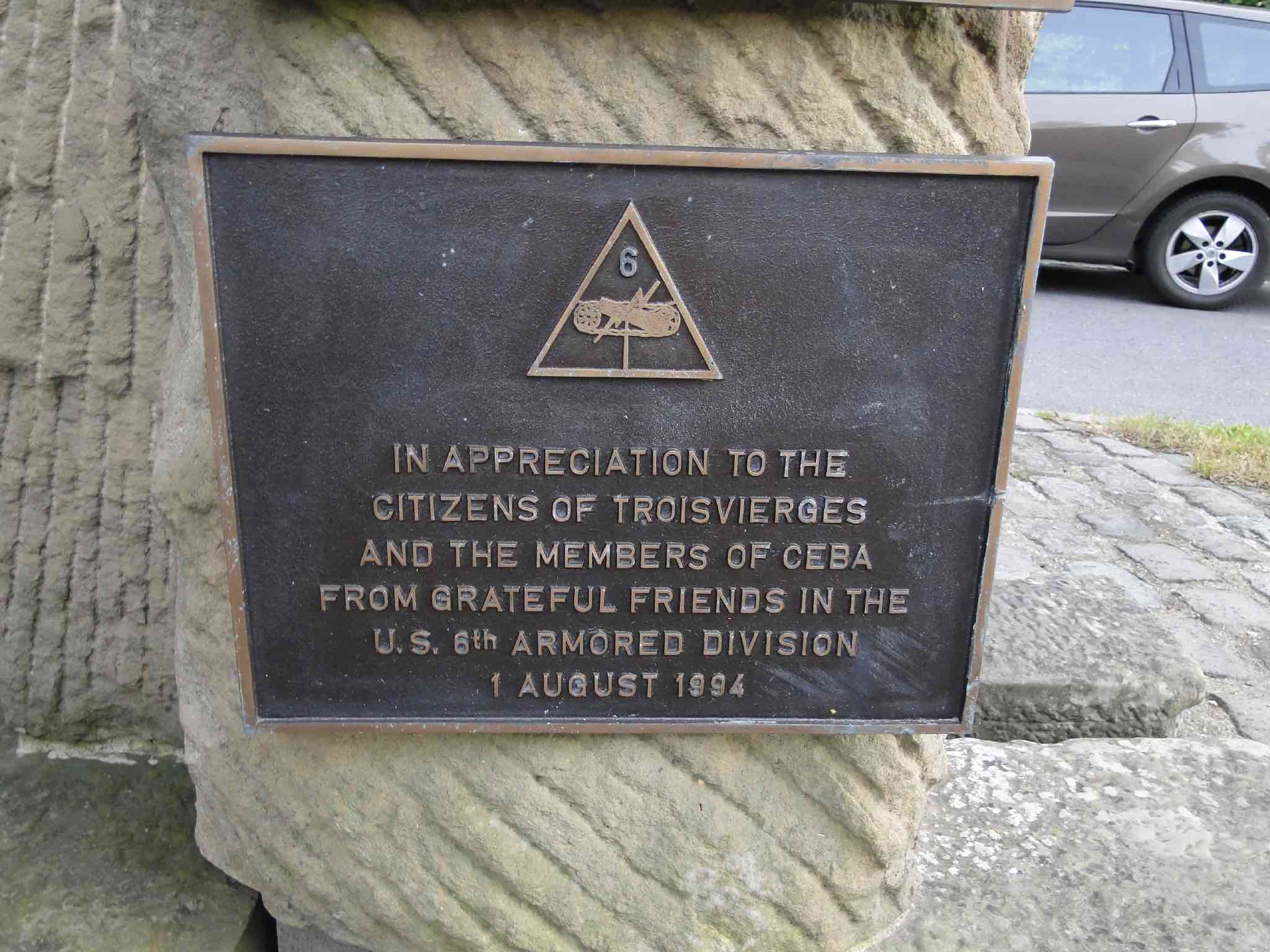 This monument is located just off of the road on the northwest side of the large German artillery canon that also occupies the side. It is located on the opposite side of the small rest area from a private residence. Plaque This tan sandstone monument rests on a darker stone and cobblestone base. Part of the monument consists of two slightly separated pieces of sandstone with deep ridges that each have a semi-circle shaped cut-out. The other, smaller piece of sandstone has similar ridges and holds two bronze plaques, both of which feature the insignia of the 6th Armored Division. The top plaque is dedicated to the soldiers of the 6th Armored Division who fought for the liberation of Troisvierges. The bottom plaque recognizes the continued appreciation of the people of Troisvierges and expresses the gratitude of the members of the 6th Armored Division. Both plaques have English text.