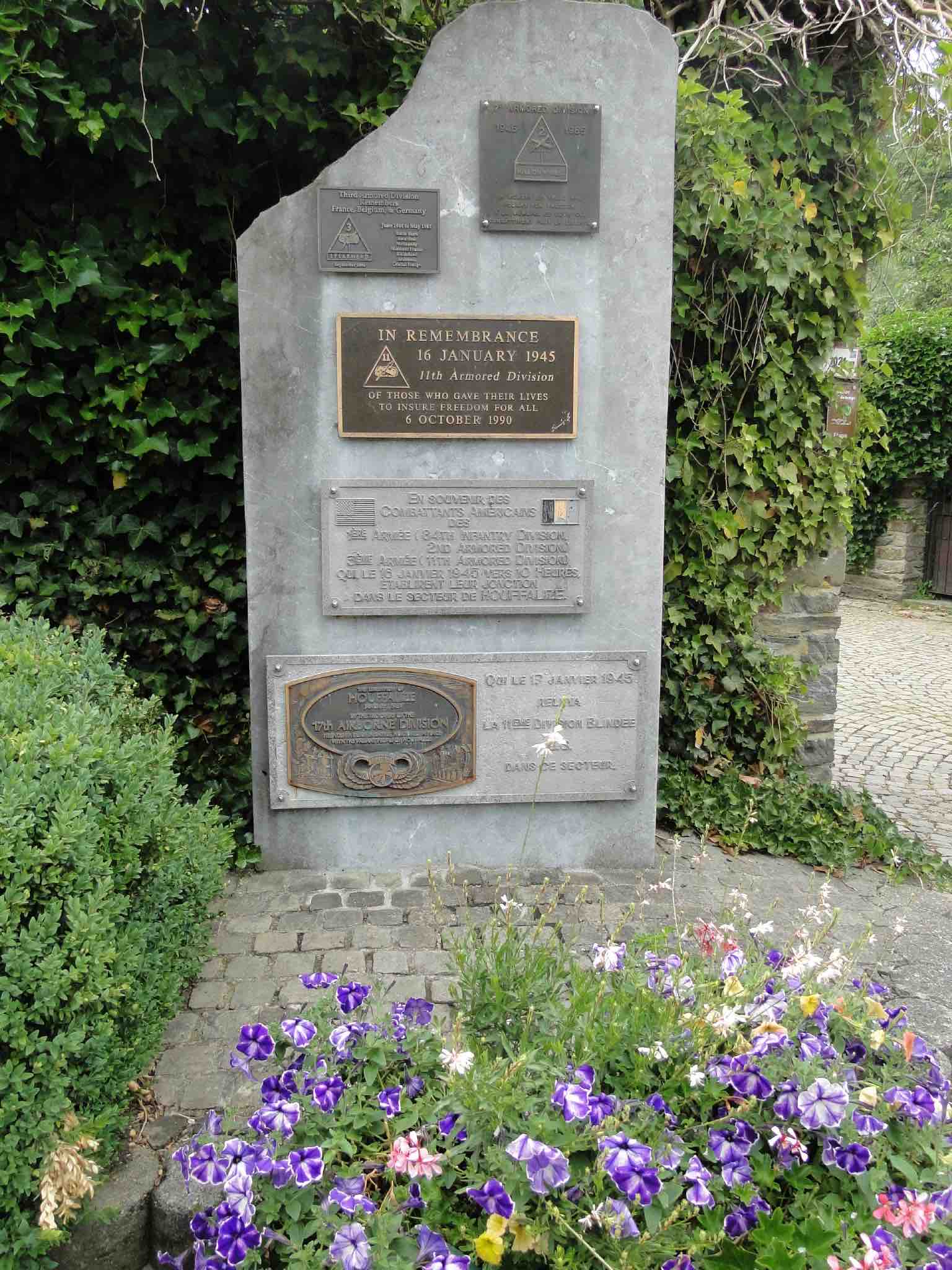 This plaque is located in the top left hand corner of the tall field stone at the Houffalize town square site. Plaque This bronze plaque features the "Spearhead" insignia of the 3rd Armored Division. The plaque's English text commemorates each of the countries and campaigns where the 3rd Armored Division fought during the Second World War.