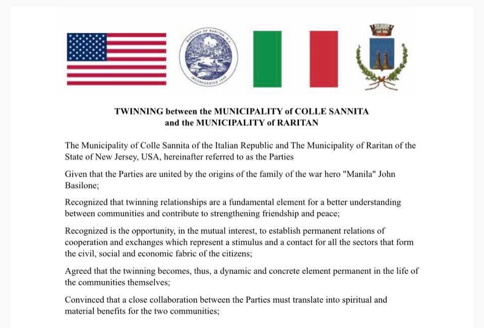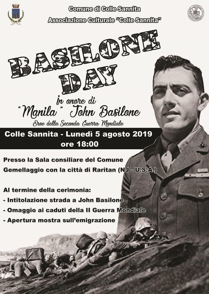 In 2019 the Cities of Colle Sannita, Italy and Raritan, New Jersey, USA became “Twinned Cities” (Gemallaggio cities in Italian) or “Sister cities”. To commemorate the cities becoming sister cities, Colle Sannita named a street after John Basilone, the son of an Italian immigrant from Colle Sannita, and a World War II US Marine who won the Medal of Honor in the Pacific theater of operations during the battle of Guadalcanal in October 1942. On August 5, 2019, the city of Colle Sannita held “John Basilone Day” to remember “Manila” John Basilone and to initiate the city twinning with Raritan, NJ. John Basilone was a Gunnery Sergeant in the US Marine Corps. He won the Medal of Honor during the battle of Guadalcanal and was later killed in action on Iwo Jima in February 1945 where his actions won him the Navy Cross for valor posthumously.