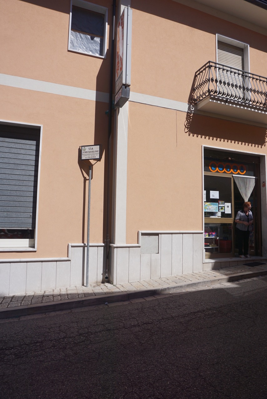The Basilone Street sign is located on street pole adjacent to a commercial shop. It is on the left side of the road as you walk from the intersection of Via Roma and Via Montegrappa.