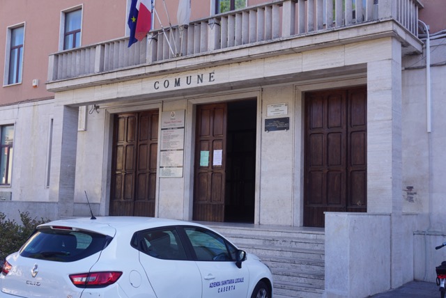 The plaque is located at the top of the left wall in the Comune building entryway.