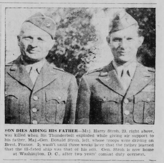 Major Harry R. Stroh, a P-47 Pilot in the 378th Fighter Squadron, 362nd Fighter Group of the 9th US Air Force, was killed while conducting a ground support combat air mission for the 8th Infantry Division. Major Stroh's father, Major General Donald Stroh, was the Commander of the 8th Infantry Division during this assault.