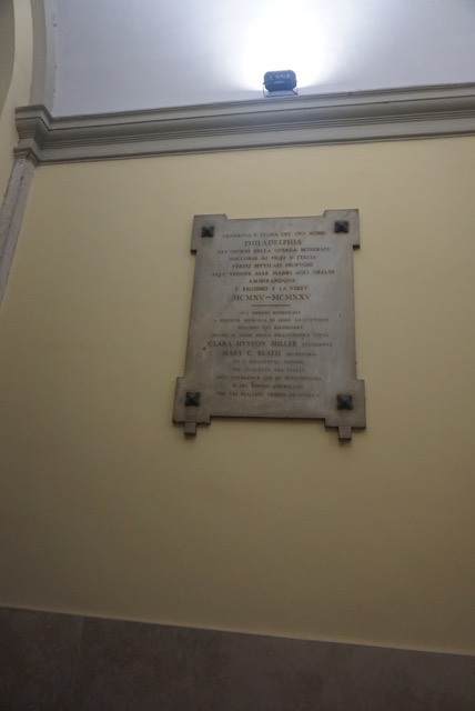 Located in the right wall of the interior portico of the building entrance next to a plaque commemorating the students of the institute who died in World War 1. Plaque A white marble inscribed plaque remembering the aid the city of Philadelphia, under the leadership of Clara Huston Miller, provided to the wounded, disabled, refuges and orphans to Italy during the First World War.