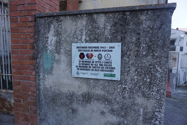 The plaque remembers the participants of the very difficult battle of Monte Pantano which occurred in late November – December 1943. Monte Pantano was located on the German Defensive line known as the “Bernhard Line”. The Bernhardt line lied just before the main German Defensive line known as the Gustav or Winter Line. The US 34th Infantry Division – The “Red Bull” Division participated in this hard fought battle. (See this website Monte Pantano for more on this battle). The Local Winter Line Museum in Venafro also has detailed displays of this battle.