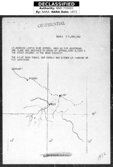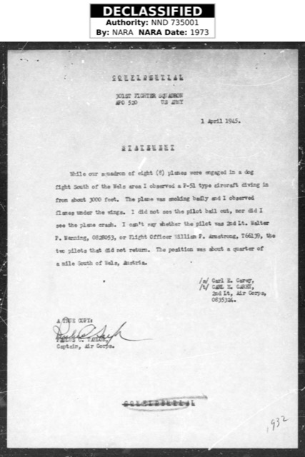 On 1 April 1945, Lt Manning was on a bomber escort mission to St. Polten, Austria flying his Mustang P-51B -15-NA-42-106943 with eight other planes in his flight. In the Wels, Austria area, about 15 miles southwest of Linz, Austria the squadron became engaged in a dog fight with Luftwaffe aircraft. Lt Manning was shot down in the Wels area but was able to bail out. He shot down an FW-190 just prior to his own loss. F/O William P Armstrong, ASN: T-66139 was also shot down in this same action, KIA crashing with his plane.