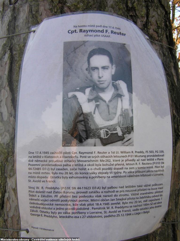 Captain Raymond “Ray” Reuter was the Commander of the 503rd Fighter Squadron, 339th Fighter Group. On April 17, 1945, Captain Reuter flying his P-51(44-72485), lead his squadron on an airfield strafing mission over the present day Czech Republic. 1LT William Preddy was his wingman flying P-51 “Rusty” (44-11623). William Preddy was the brother of the famous P-51 Mustang Ace, George Preddy. Both Reuter and Preddy were killed on this mission.