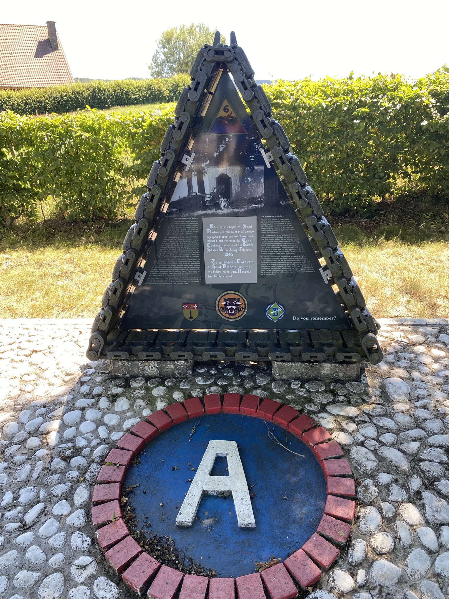 Monument is located just off of the Haapstrooss (CR332) to the immediate southeast of Lullange beside a small chapel. Monument Triangle monument made of tank tracks sitting on a ground level star shaped platform, with flagpole to the right rear of the monument.
