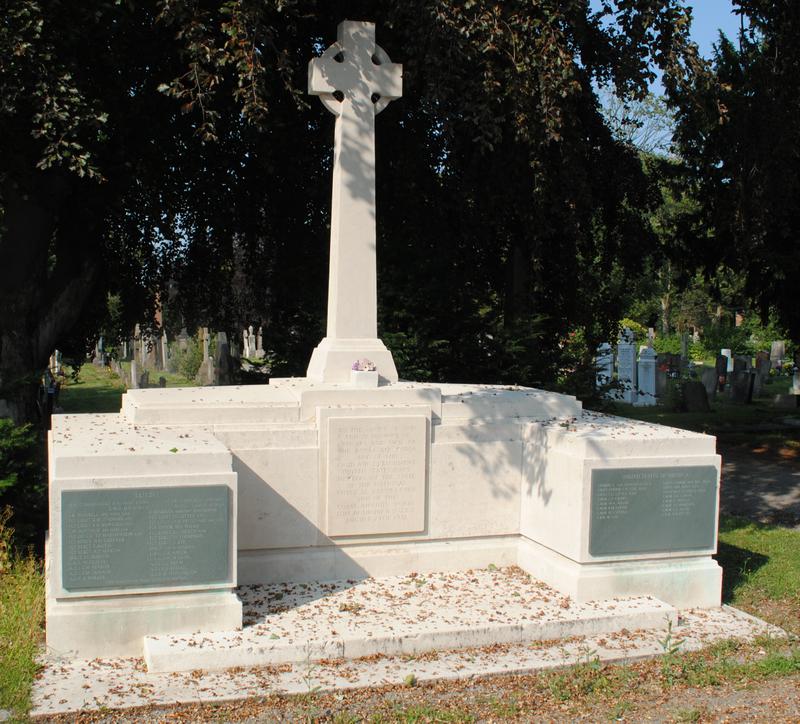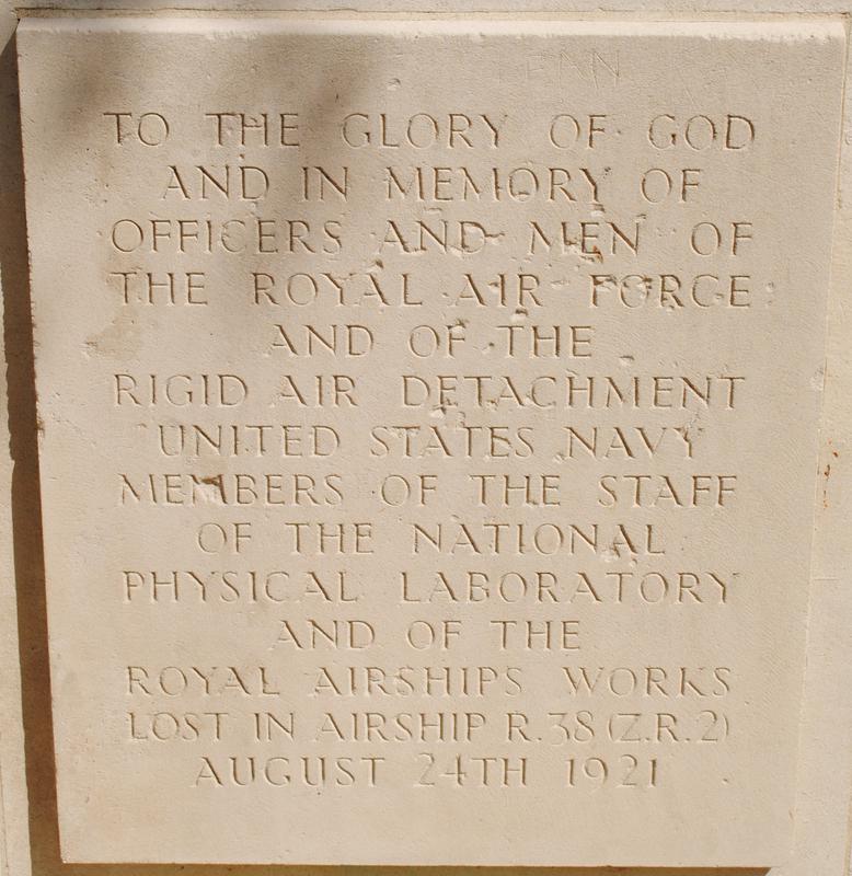Free-standing stone chest topped with stone cross. Low stone chest has lower projections at either end with bronze plaques listing all the names of those who died in the disaster. On the left plaque lists the 28 British servicemen and, on the right, the 16 American servicemen who died on August 24, 1921. The center plaque bears the dedication message. This airship, R38/Z.R.2, was constructed at Howden. It exploded and fell into the River Humber on its final trial flight.