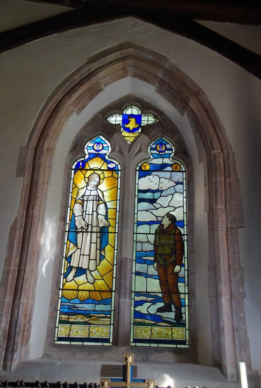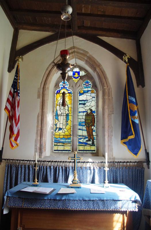 The chapel window has two main lights - the left depicting a figure of Christ and the right, an American airman and a flight of aircraft. Both lights are with badges of the 8th Air Force and 2 squadron insignias each on the top. The small stained glass at the top center is the insignia of the 96th Bomb Group. The memorial is a tribute to the men 96th Bomber Group who gave their lives in the fight for freedom. The idea for the memorial was first promoted by CPT Herbert Allen, 338th BS flight surgeon in April 1944.