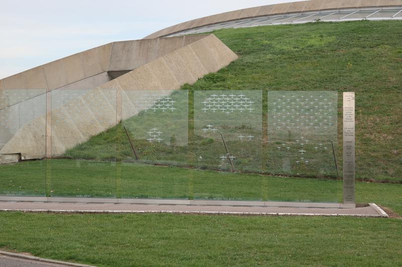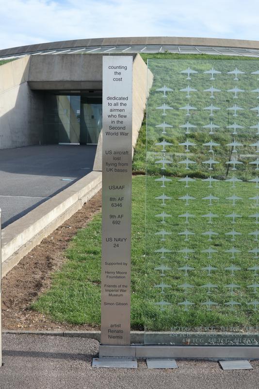 'Counting the Cost' is made up of 52 glass panels, engraved with silhouettes of over 7,000 American aircraft that were lost during operations. The panels are formed into two segments, 43 panels on the left and 9 panels on the right; the ramped walkway is in between. The memorial is a tribute to the 30,000 American airmen who lost their lives serving from UK bases during the Second World War. The glass panels represent the U. S. aircrafts which were lost in the war (8th Army Air Force: 6346 aircrafts; 9th Army Air Force: 692; U.S. Navy: 24). 4 metals frames (2 on each segment) contain the same message inscriptions.