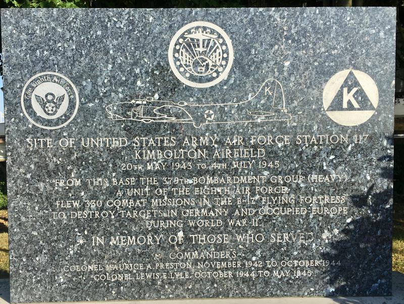 A black rectangular marble stone monument inscribed in English text and flanked by US and British flag on either side. On the top side of the monument, a printed illustration of an aircraft with “K” tail-mark surrounded by the insignias of the 8th Air Force on the top left, an unknown insignia on the top-center, and the 379th BG (Heavy) on the top-right. The monument is dedicated to the men and unit of 379th Bomber Group who served at RAF Kimbolton in World War II.