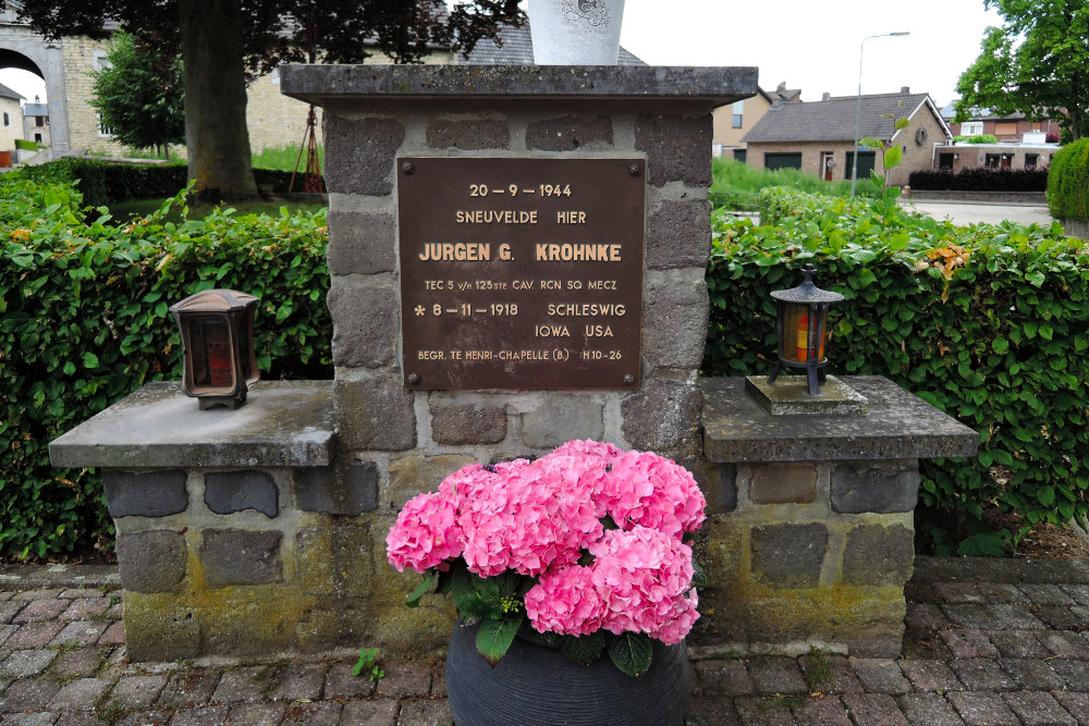 The memorial remembers Technical Grade 5 Jurgen “Jerry” Krohnke who was killed on this spot on September 20, 1944 while liberating the town of Bocholtz, Netherlands. T5 Krohnke was assigned to the 125th Cavalry Reconnaissance Squadron (Mechanized) of the 113th Cavalry Group “Red Horse” which was supporting the 30th Infantry Division attack into the enemy West Wall defenses.
