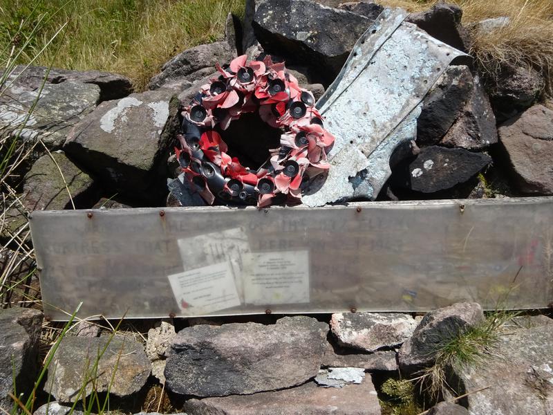 A loose cairn with a large upright stone on top and a wooden dedication board covered in perspex on the base. The wooden board is inscribed in English and has a painted depiction of a B-17 on the right side. The current state of the inscription is nearing its illegibility as its perspex cover has aged and weathered so losing its transparency. Not far from the memorial is a scar where the aircraft burned, containing small fragments left by the fire.