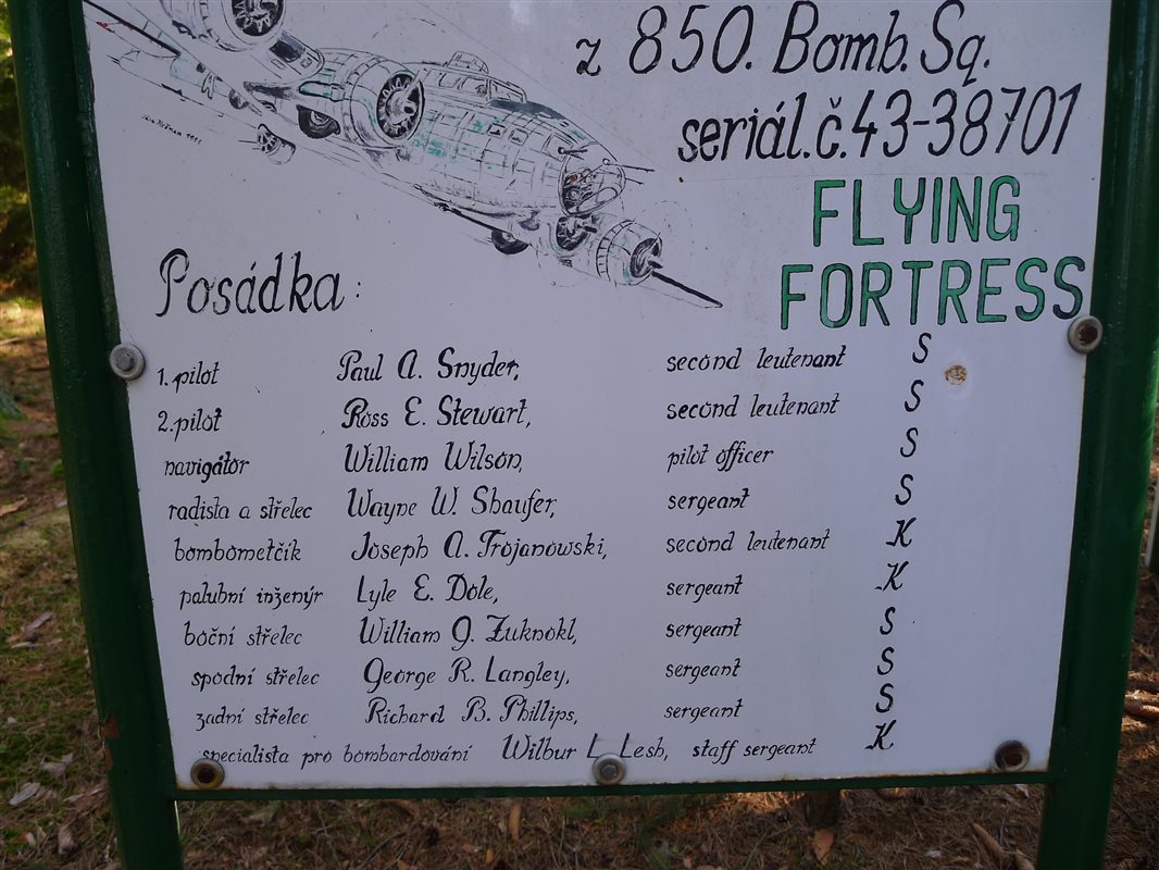 Two metal panels that serve as commemorative plaques affixed on a standing metal frame with a roof. The plaques are written with a Czech inscription honoring and listing the names, ranks, and roles of the crew of the B-17G 43-38701. Near the plaques are an information board that contains detailed information about the accident, including copies of the "Missing Air Crew Report" / MACR / for this event, and a small fenced area that has small parts of the aircraft. After the war, a cross memorial was placed by a local, Mr. Chocholoušek, at the site of the impact, and a garden was built, in which the wreckage of the plane was.