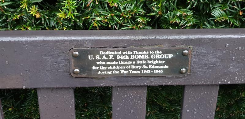 A wooden bench with a commemorative plaque attached to the center of the backrest. The plaque is a rounded rectangle with a black background and is inscribed with English and white letter message. The plaque is dedicated to the 94th Bombardment Group of the 8th Air Force which was stationed at RAF Bury St Edmunds (also known as Rougham airfield) during World War II.