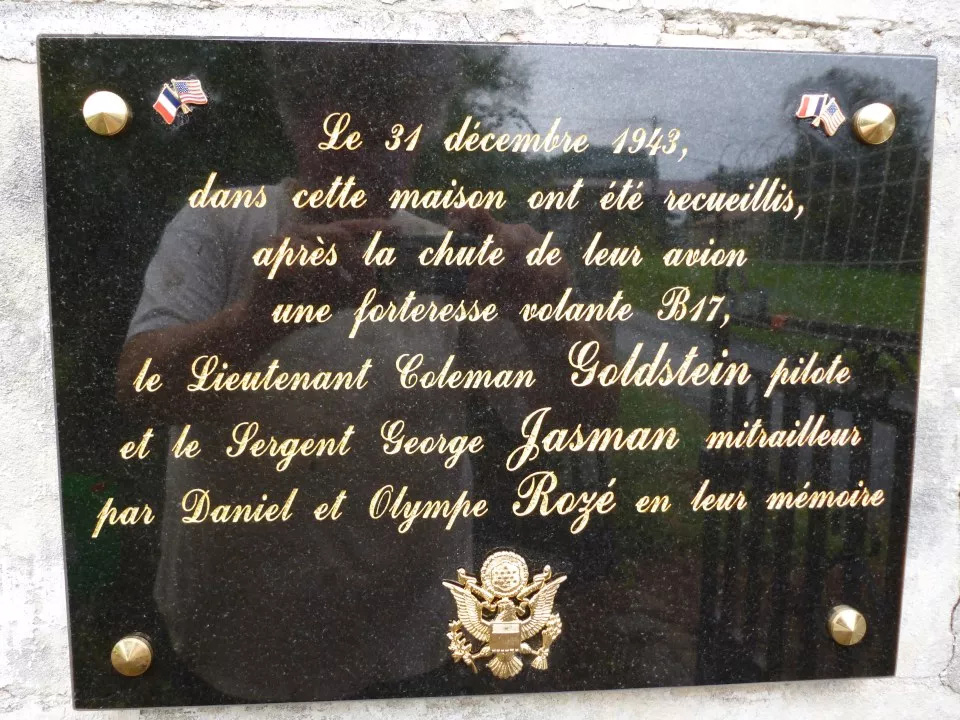 A rectangular, black, stone plaque, containing a message written in French in gold lettering. On the bottom of the plaque is the US Army Air Corps Officer’s cap badge. The plaque remembers 2Lt Goldstein (pilot) and Sgt Jasman (gunner), who were crew members of the B-17 # 42-3186 that crashed in Experimont. They were taken into this house after the fall of their plane. Through the help of the French resistance, they evaded German capture. They both arrived back in the UK in March 1944.