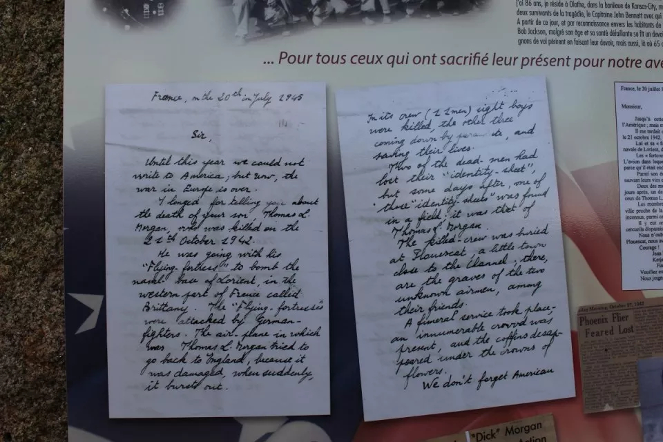 L'histoire s'arrêterait là si, au moment des faits, un habitant de la commune n'avait pas récupéré la plaque militaire d'un des soldats américains, le Lieutenant Thomas Morgan, en vue de l'expédier à sa famille, avec une lettre de reconnaissance et de réconfort envers les familles de ces valeureux soldats venus libérer notre patrie.