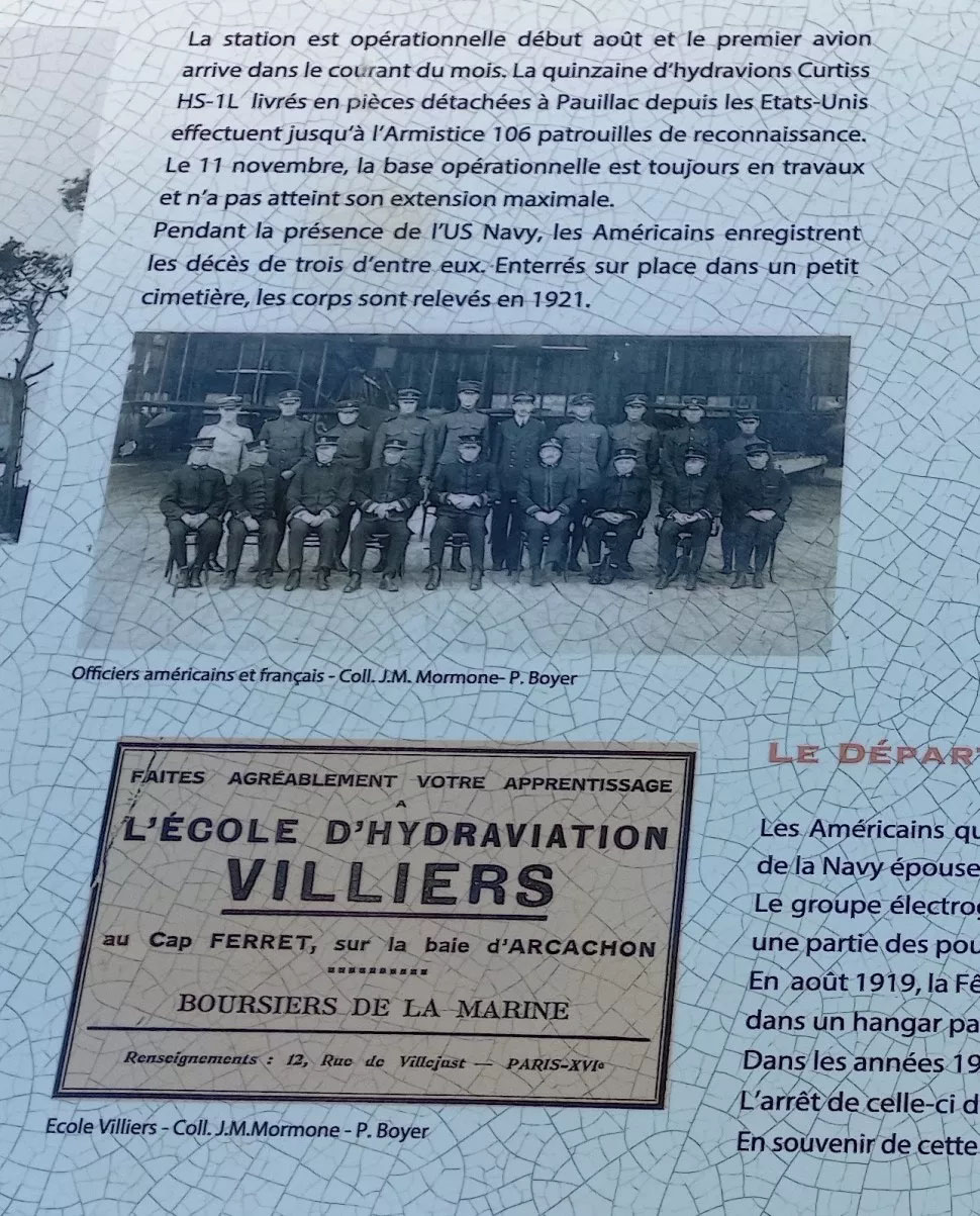 The station was operational at the beginning of August and the first aircraft arrived later that month. The fifteen or so Curtiss HS-1 L seaplanes delivered in parts to Pauillac from the United States carried out 106 reconnaissance patrols until the Armistice. On 11 November, the operational base was still under construction and had not reached its maximum extension.