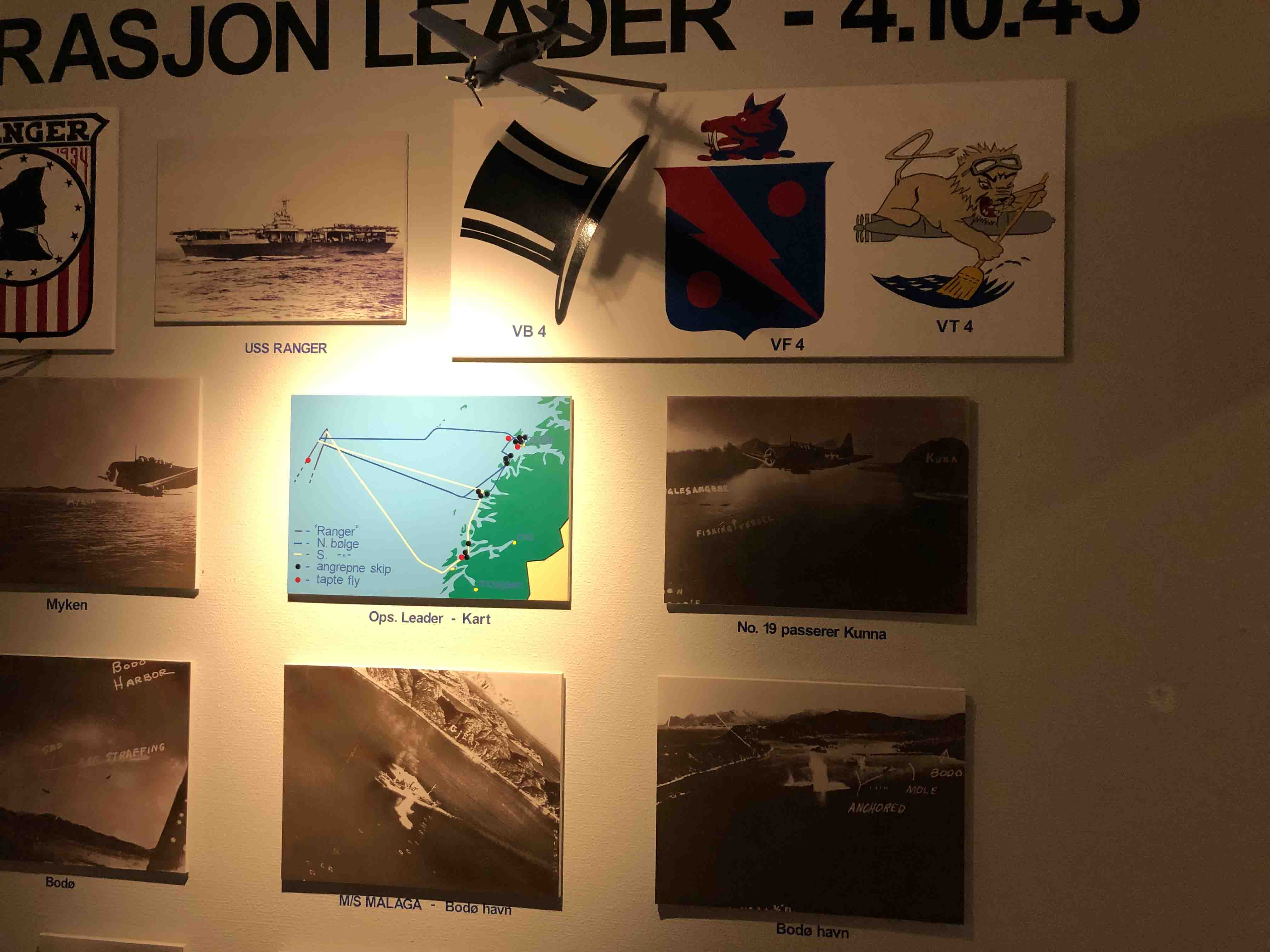 The exhibit includes an aircraft engine relic from SBD-5 Dauntless No. 19, a model of the aircraft on the side wall, and behind the engine is a wall with various pictures and a rectangular board that relates to Operation Leader in World War II. In Operation Leader, TBF "Avenger" and SBD "Dauntless" aircraft, escorted by F4F "Wildcats" from USS Ranger (CV-4) attacked convoys in the harbor of Bodo, Norway on October 4, 1943. The aircraft sank five German and Norwegian steamers and badly damaged four others while killing about 200 enemy troops. This mission was the only U.S. Navy carrier operation in northern European waters during World War II. Support was provided by Royal Navy battleships HMS Duke of York and HMS Anson, USS Tuscaloosa (CA-37), and a U.S. Navy destroyer division. The attack stung the Germans who were arrogant about the Norway occupation and proved that ships and air squadrons of the United States and Royal Navies could work together.