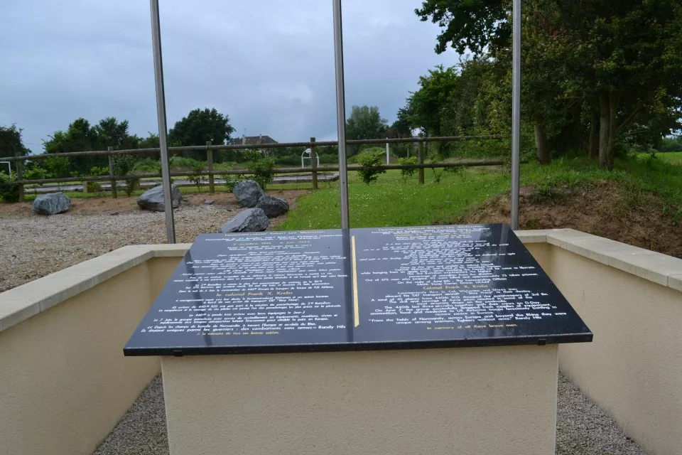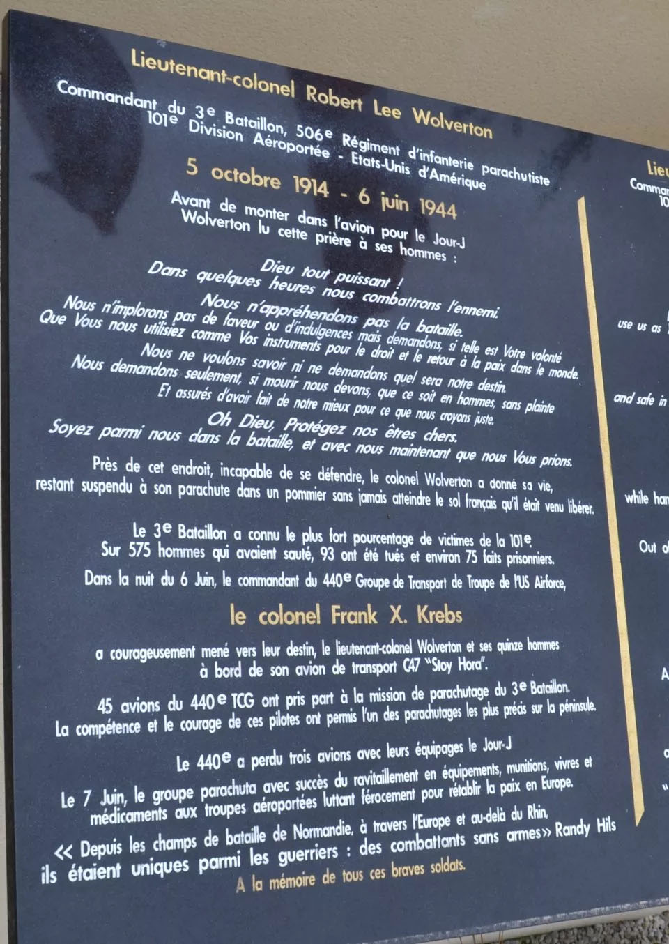 A large, rectangular, granite tablet set on a concrete block as its base containing a commemoration message, a prayer of LTC Wolverton, and his fate. Colonel Krebs is also mentioned as well as the 440th Troop Carrier Group’s action and loss on June 7, 1944.