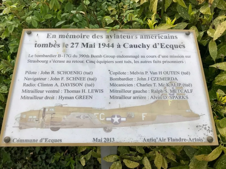 A rectangular white plaque supported by a beam. The plaque is inscribed with a commemoration message that is written in French and lists 10 names on it, as well as their status and role in the plane. An image of a B-17 is also printed on the plaque. B-17G #42-97295 crashed 300 meters east of Cauchie-d'Ecques after being shot by flak on May 27, 1944. Five members were killed in this incident while the rests were able to survive but later were taken as prisoners.