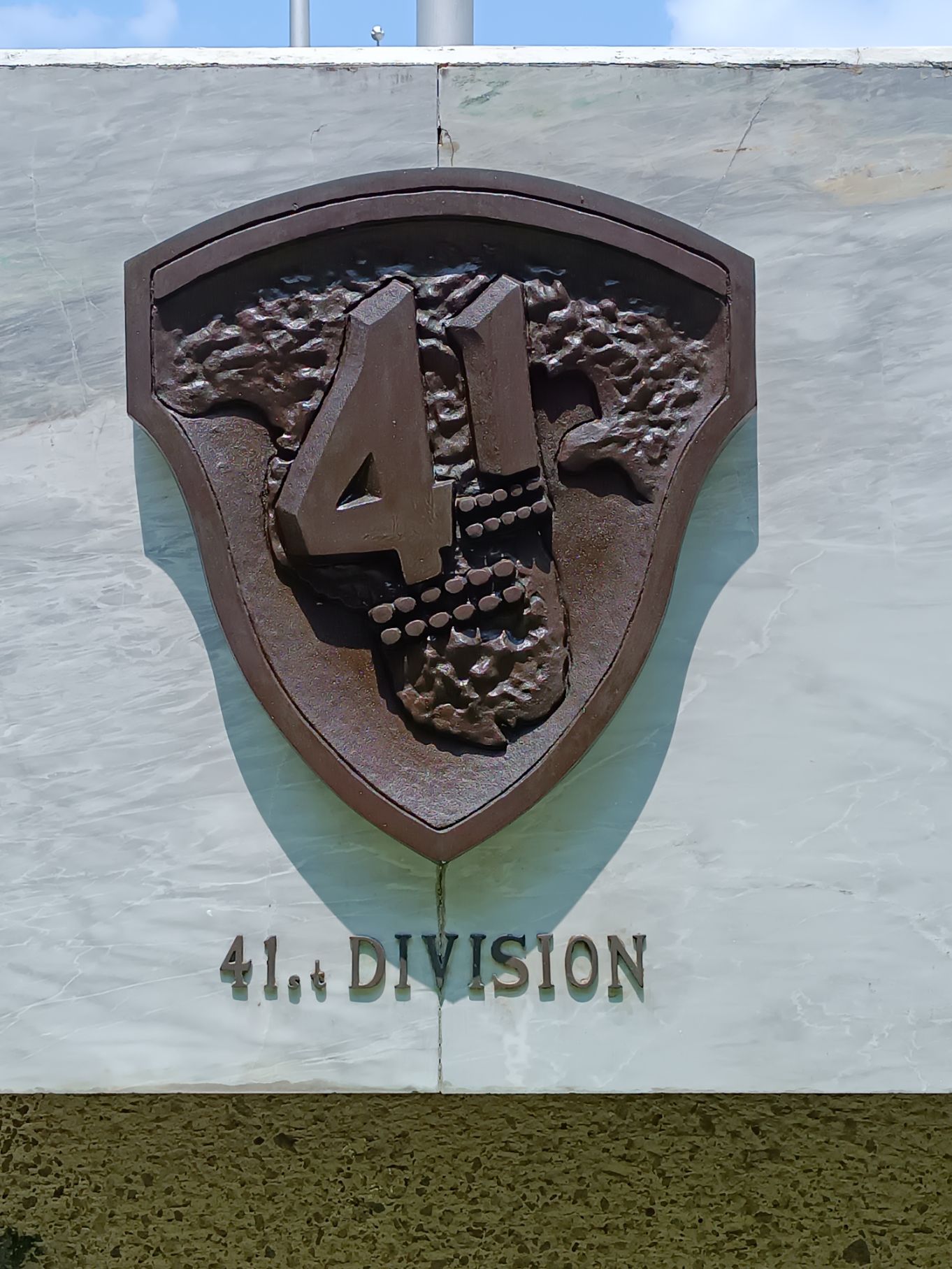 The Colonnade is a marble-clad structure surrounded by an esplanade, itself surrounded by marble-clad parapets. The outer side is covered with 19 high relief sculptures by National Artist Napoleon Abueva, and alternates depictions of the war with 18 bronze insignia of USAFFE Division units by Talleres de Maximo Vicente, Leonides Valdez, and Angel Sampra and Sons. Each bronze insignia has a flagstaff for the flags of each division.