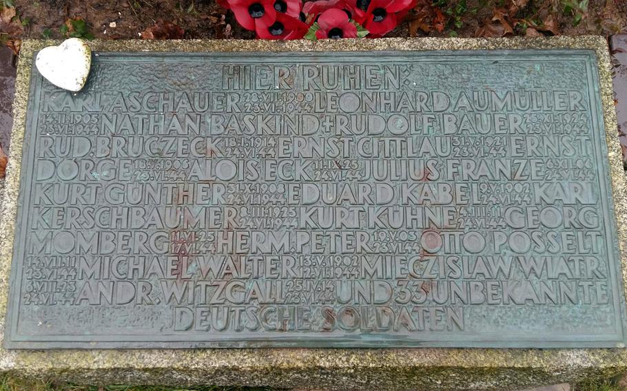 The plaque marks the location where First Lieutenant Nathan Baskind of the 899th Tank Destroyer Battalion (attached to the 9th Infantry Division) laid in an unknown grave from 1944 to 2024. In 2024 he was positively identified and laid to rest on the 80th Anniversary of his death at the Normandy American Cemetery in France.