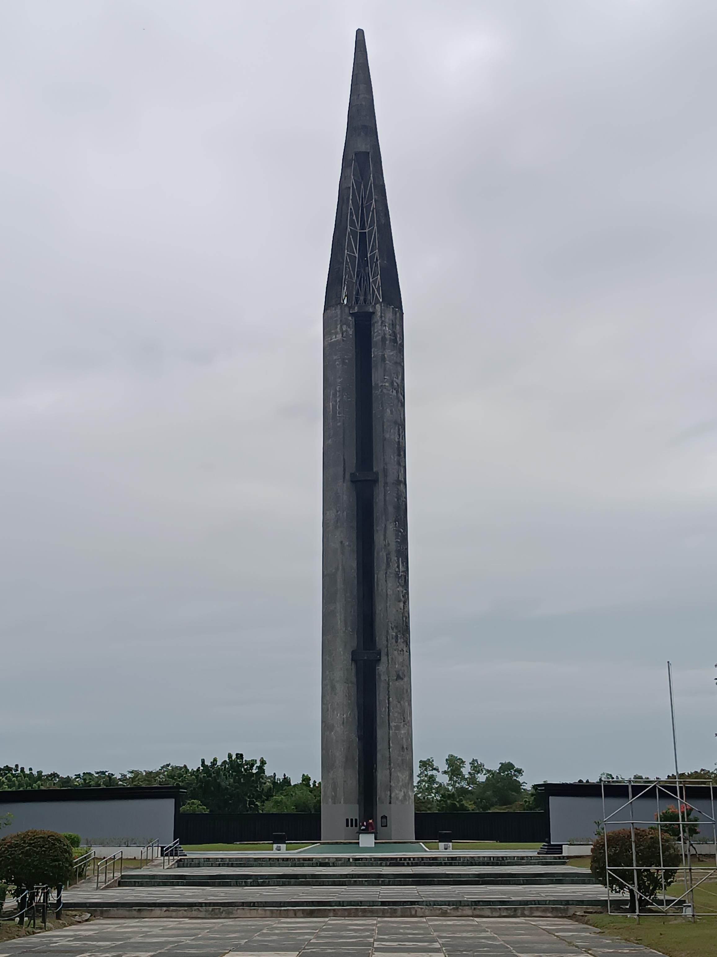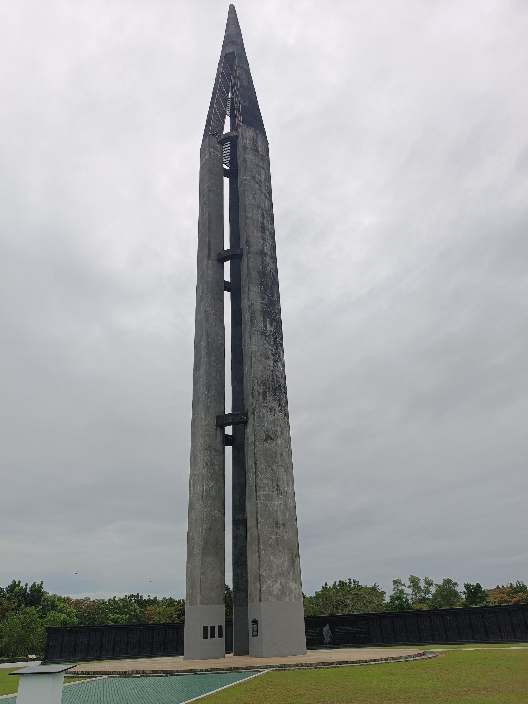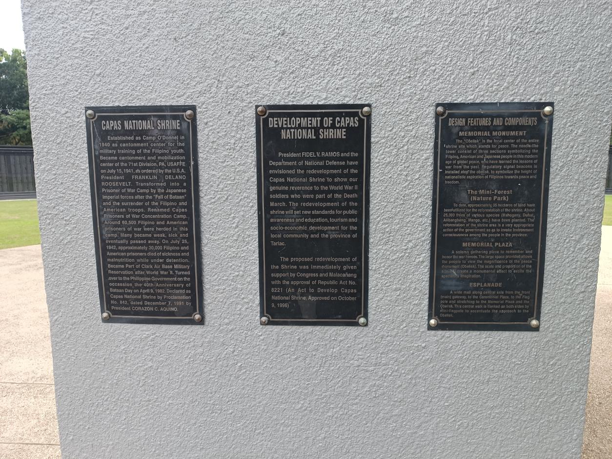 A 73-meter (240 ft) gray obelisk monument divided into three sections, symbolizing the unity and shared aspiration for world peace among the Filipino, American, and Japanese people. Beneath the monument, plaques mounted on the wall recount the area's history during the Bataan Death March.