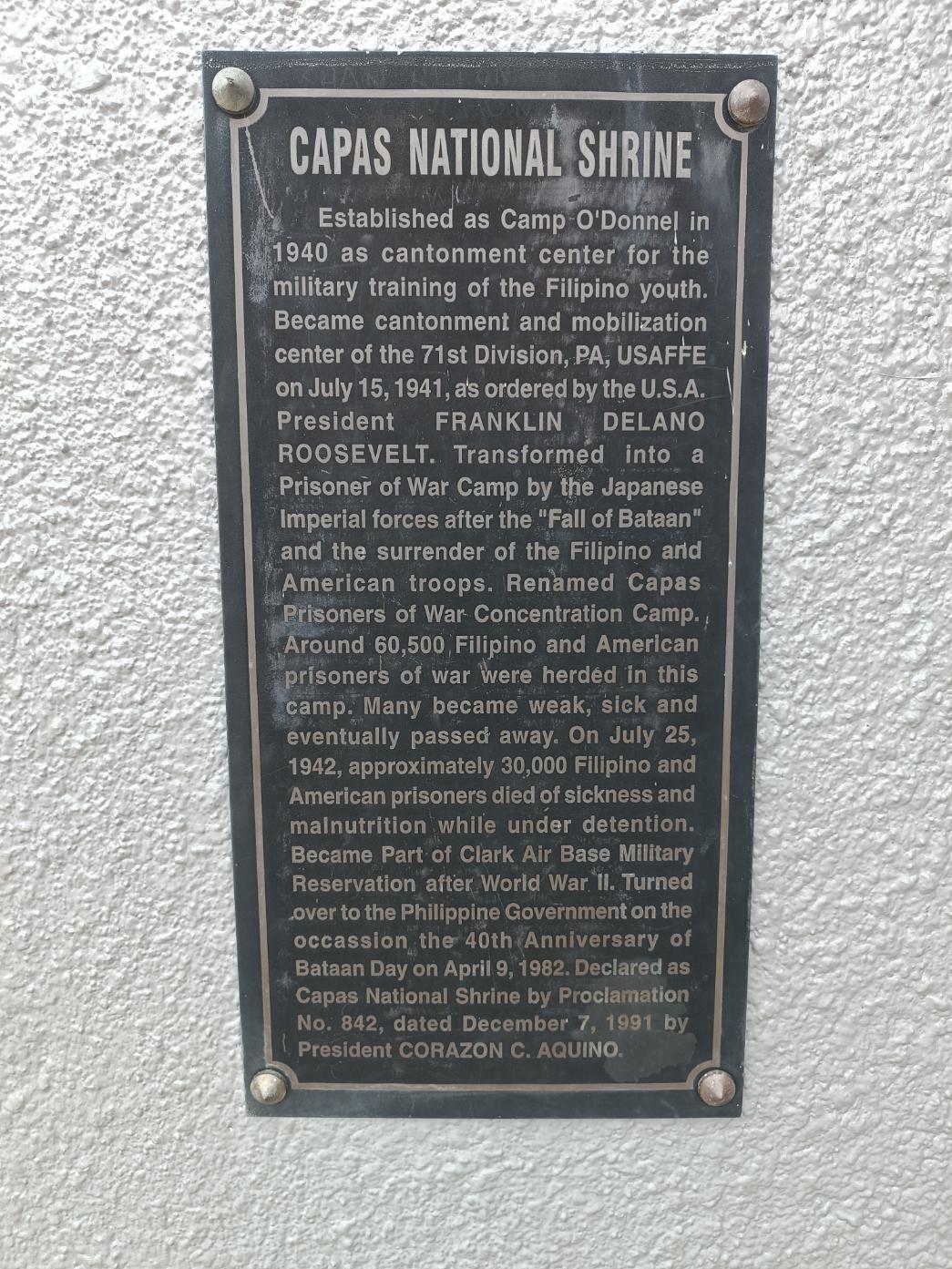 ESTABLISHED IN 1940 AS CAMP O'DONNELL. SERVED AS A PRISONER FOR OVER 40,000 FILIPINO SOLDIERS AND 9,000 AMERICAN SOLDIERS WHO WERE PART OF THE WAR AND SUBJECTED TO A DEATH MARCH. MORE THAN 30,000 DIED IN THIS CAMP FROM DISEASE AND OTHER SUFFERING FROM APRIL TO JUNE 1942. THE DEAD HEROES WERE BURIED IN A SINGLE GRAVE. KNOWN AS THE CAPAS CONCENTRATION CAMP. BECAME PART OF THE CLARK AIR BASE MILITARY RESERVATION AFTER WORLD WAR II. RETURNED TO THE REPUBLIC OF THE PHILIPPINES 9 APRIL 1982. DECLARED A NATIONAL HAZARD 9 OCTOBER 1991.