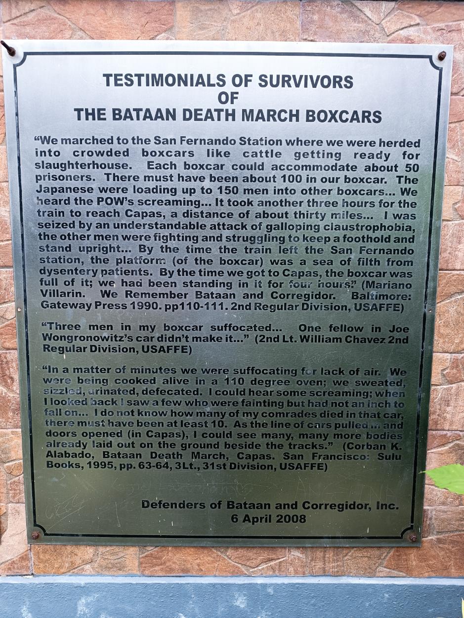 After the Death March which claimed many lives, Filipino and American prisoners of war, having walked 105 kilometers from Mariveles and Bagac, Bataan under the intense April heat, were assembled in San Fernando, Pampanga and were loaded into boxcars. This boxcar, and many like it, were used to transport Filipino and American prisoners of war - the defenders of Bataan and Corregidor - from San Fernando Pampanga to prison camps in Capas, Tarlac after the long march. It was one of the many freight cars of the Manila Railroad Company before the World War II. Measuring about six feet long, eight feet wide and six feet high, this boxcar had wooden walls and metal roof. A larger version made of steel, was 33 feet long, seven feet high and eight feet wide. At San Fernando, the prisoners were loaded into the boxcars by the Japanese guards who used their rifle butts and bayonets to squeeze more people than the capacity of the boxcars. Fifty to sixty men were forced into this particular type of car. As many as one hundred fifty to one hundred sixty men were crammed into the larger version of this boxcar. The boxcars so tightly packed that it became impossible to sit down. The only source of ventilation and air was a tiny slit in the door of each boxcar. The car, under the sweltering sun, rapidly became an oven, and men suffocated in the heat. Those afflicted with dysentery could not control their defecation and soon the floor of the car was filthy with excrement, urine and vomit. Many died where they stood in the boxcars. This boxcar is the last known surviving freight car of its kind, and is a mute witness to the human sacrifice and heroism of all those who were victims of the Bataan Death March. It serves as memorial to the horrors of war and to man's inhumanity to his fellow man.