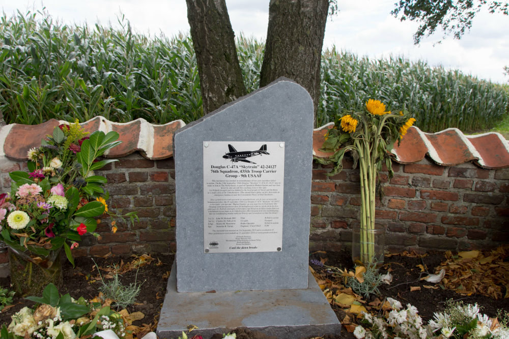 The memorial remembers the crew of the C-47 (42-24127) of the 76th Squadron, 425th Troop Carrier Group that was shot down here during "Operation Market" Garden on September 19, 1944.