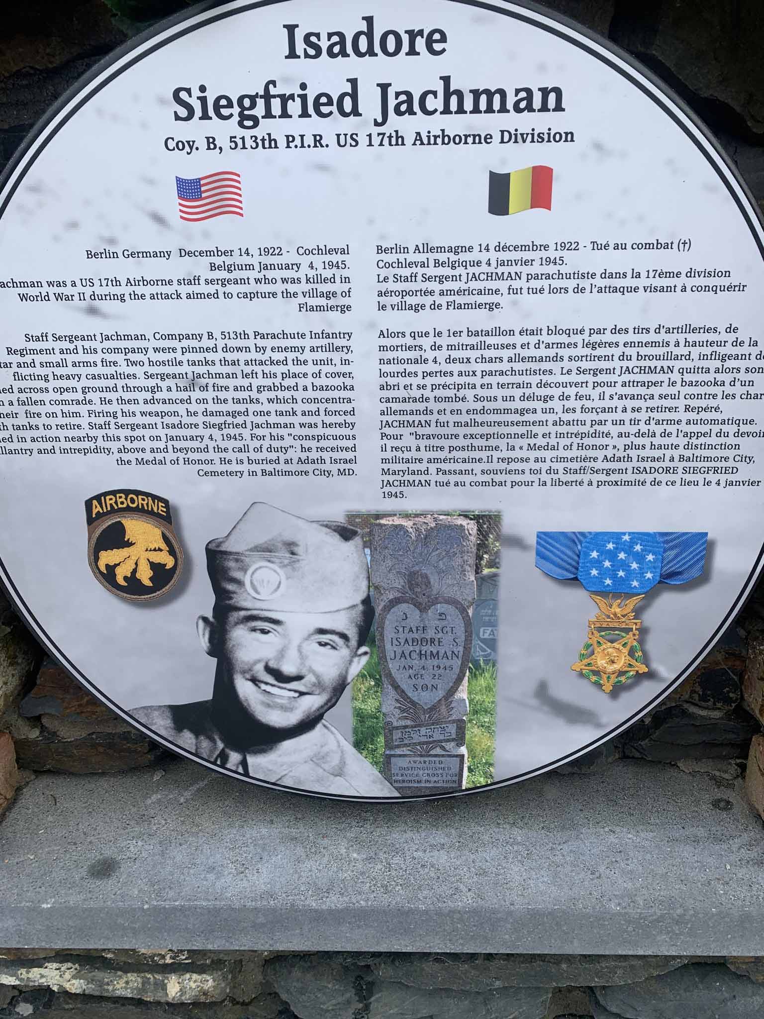 Alors que le 1er bataillon était bloqué par des tirs dartilleries, de mortiers, de mitrailleuses et darmes légères ennemis à hauteur de la nationale 4, deux chars allemands sortirent du brouillard, infligeant de lourdes pertes aux parachutistes. Le Sergent JACHMAN quitta alors son abri et se précipita en terrain découvert pour attraper le bazooka dun camarade tombé. Sous un déluge de feu, il savança seul contre les char allemands et en endommagea un, les forçant à se retirer. Repéré, JACHMAN fut malheureusement abattu par un tir darme automatique. Pour bravoure exceptionnelle et intrépidité, au-delà de lappel du devoir, il reçu à titre posthume, la <<Medal of Honor>>, plus haute distinction militaire amèricaine. Il repose au cimetière Adath Israel à Baltimore City, Maryland. Passant, soviens toi du Staff/Sergent ISADORE SIEGFRIED JACHMAN tuè au combat pour la liberté à proximité de ce lieu le 4 janvier 1945.