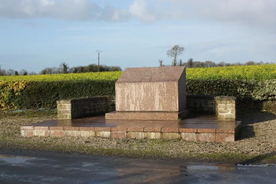 A carved stone monument with white inlaid writing on a slab of stone surrounded by a half-circle stone wall. There is an information panel nearby.