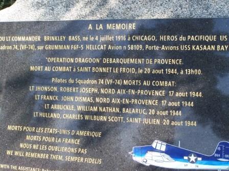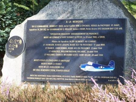 A boulder with a small and big black plaque. The larger plaque has a gold text commemorating LCDR Bass and others of his squadron who fell in the area during Operation Anvil Dragoon.