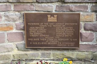 The monument itself is a small metal plaque mounted on a stone wall 2 ft. (.6m) high that honors the soldiers of the 1255th Combat Engineers who died in the liberation of Vianden, Luxembourg.