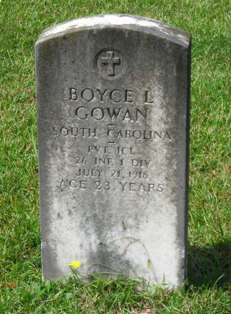 Boyce L. Gowan served in the U.S. Army during World War I as a Private in HQ Company, 26th Infantry Regiment, 1st Infantry Division. He was Killed in Action on July 21, 1918 (at the age of 23) and is now buried in Oakwood Cemetery, Spartanburg, Spartanburg County, South Carolina, USA. His name is inscribed on the Buzancy monument as a Private.