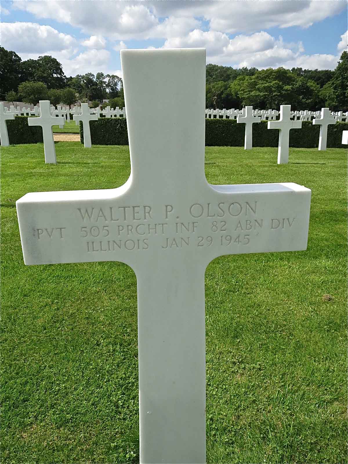 Walter P. Olson entered the military service in Illinois. He served in the U.S. Army during World War II as a Private in Company F, 505th Parachute Infantry Regiment, 82nd Airborne Division. He died from his wounds received in battle on January 29, 1945 and is now buried in Cambridge American Cemetery, Cambridge, United Kingdom.