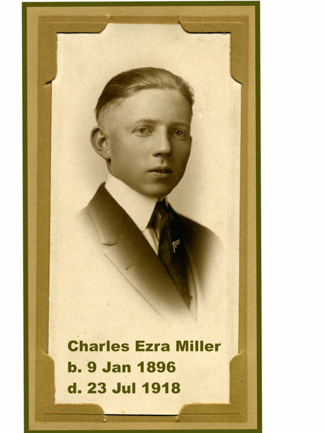 When Charles Ezra Miller was born on January 9, 1896, his father, Jesse, was 46 and his mother, Annie, was 40. He entered the military service in Montana and served in the U.S. Army during Wolrd War I as a Private First Class in Company F, 16th Infantry Regiment, 1st Infantry Division. He was Killed in Action but declared "Missing" on July 23, 1918 and is memorialized on Tablets of the Missing, Aisne-Marne American Cemetery, Belleau, France.