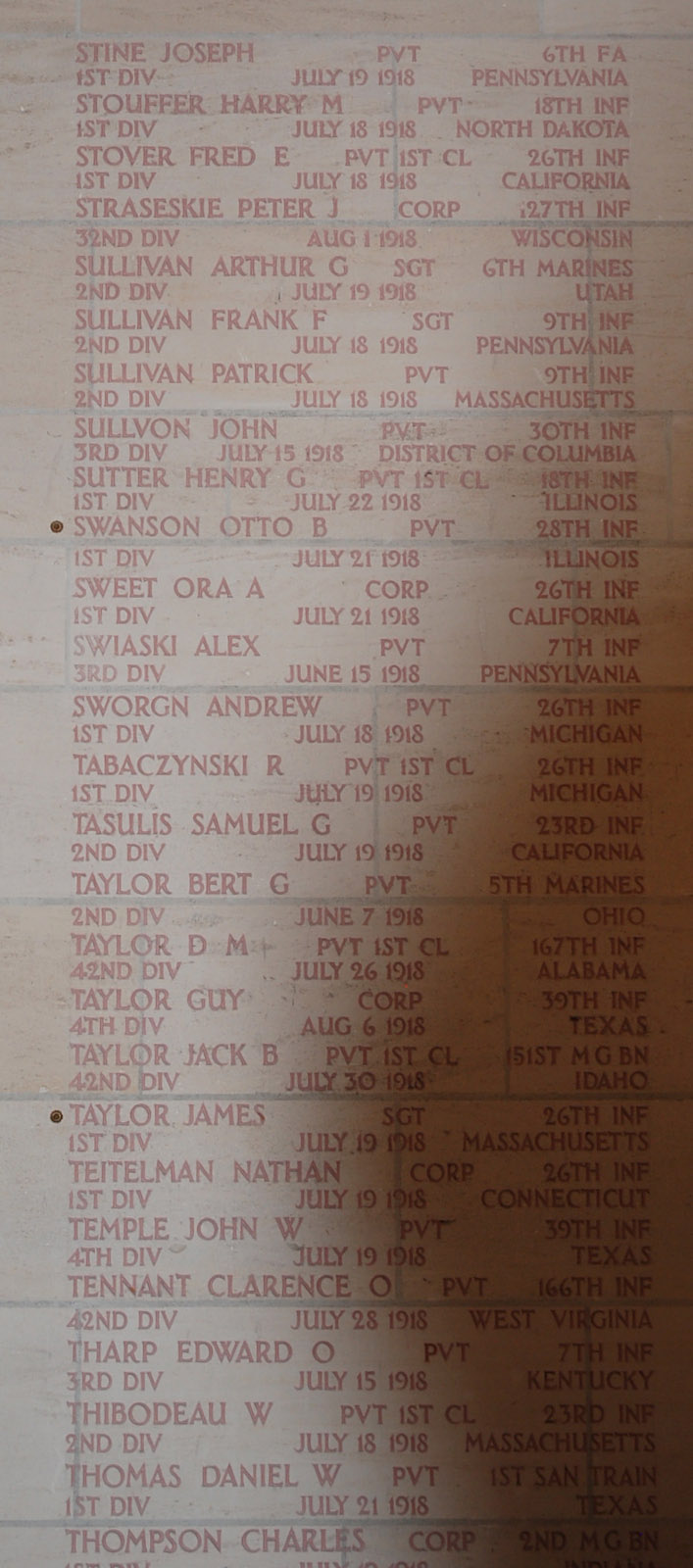 Harry M. Stouffer entered the military service in North Dakota. He served in the U.S. Army during Wolrd War I as a Private in Company B, 18th Infantry Regiment, 1st Infantry Division. He was declared "Missing in Action" on July 18, 1918 and is commemorated on Tablets of the Missing, Aisne-Marne American Cemetery, Belleau, France. His name is commemorated on the Buzancy monument in the MISSING IN ACTION section of the monument.