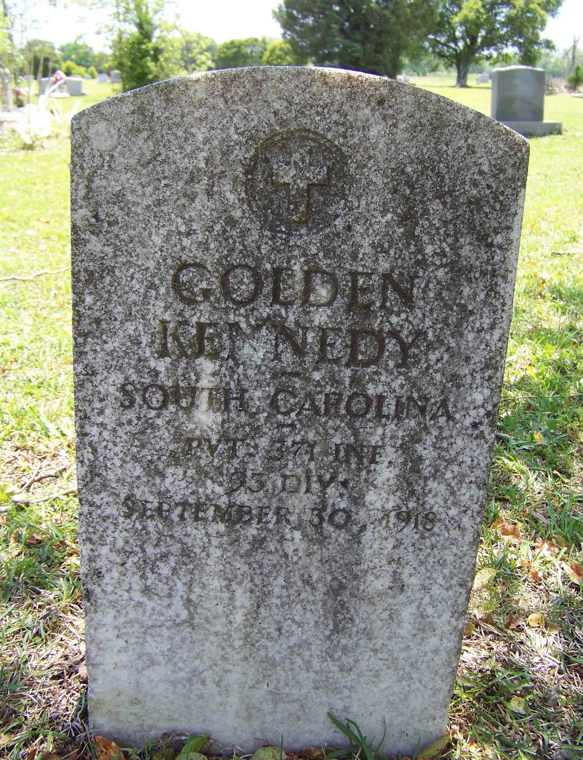 Golden Kennedy was born in September 1895. He served in Company G, 371st Infantry Regiment, 93rd Division (Colored) as a Private during World War I. He was Killed in Action on September 30, 1918 and is now buried in the Saint John AME Church Cemetery, Bishopville, Lee County, South Carolina, USA.