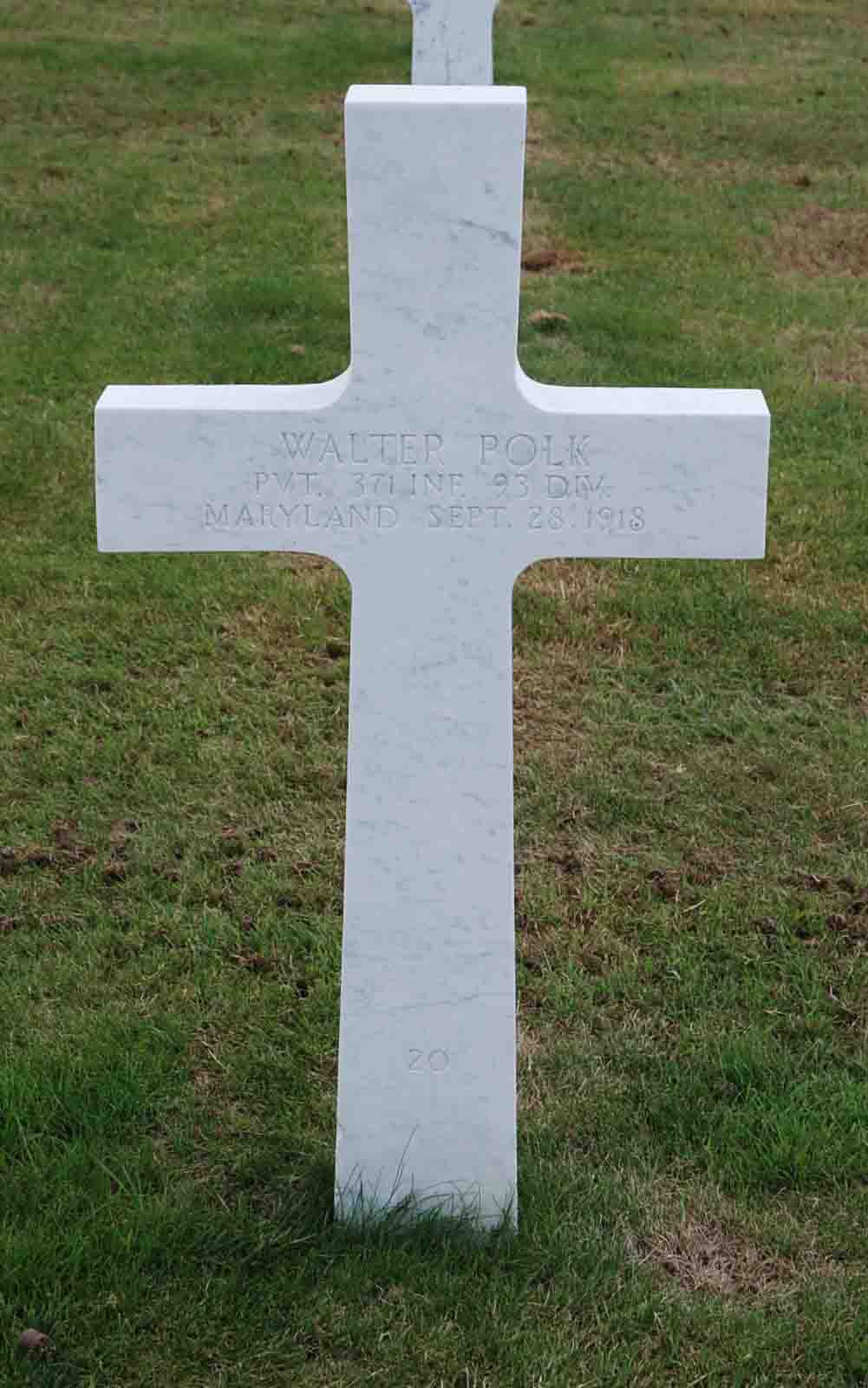 Walter Polk was born on April 20, 1893 in Maryland. He served in Company G, 371st Infantry Regiment, 93rd Division (Colored) as a Private during World War I. He died on September 28, 1918 and is now buried in the Meuse-Argonne American Cemetery and Memorial, Romagne-sous-Montfaucon, Departement de la Meuse, Lorraine, France.