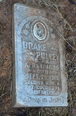Drake Pulley was born on April 1, 1895. He served in Company D, 371st Infantry Regiment, 93rd Division (Colored) as a Private during World War I. He died on September 29, 1918 at the age of 23 and is now buried in the Saint John Baptist Church Cemetery, Cross Hill, Laurens County, South Carolina, USA. Pvt Pulley's name is commemorated on the 371st Infantry Regiment monument in Ardeuil, France but his surname is inscribed as Pulle.