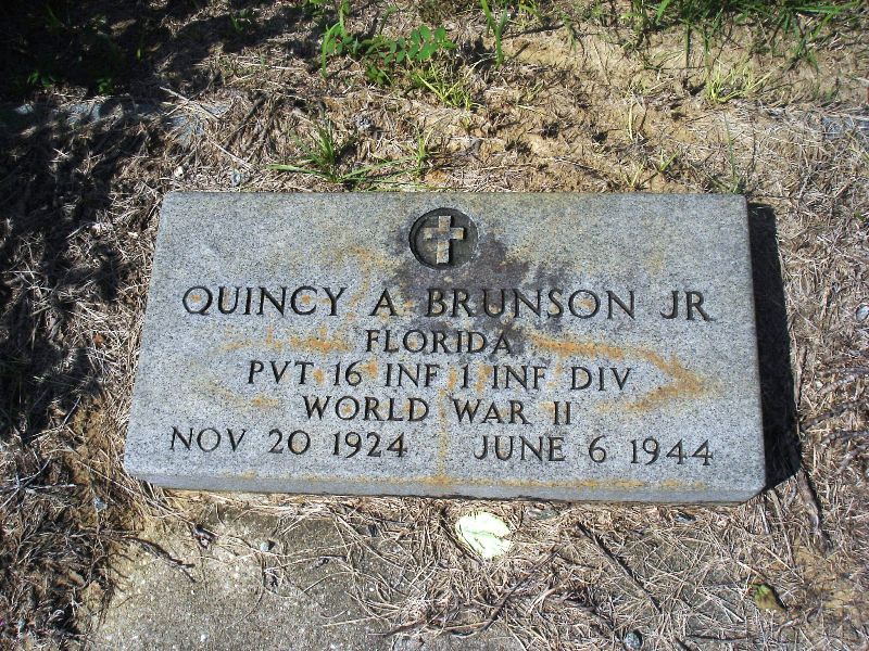Quincy A. Brunson, Jr. was born on November 20, 1924. He served in the U.S. Army during World War II as a Private in the 16th Infantry Regiment, 1st Infantry Division. He died on June 6, 1944 during the invasion on Omaha Beach, France at the age of 19 and is now buried in Pilgrims Rest Baptist Church Cemetery, Baker, Okaloosa County, Florida, USA.