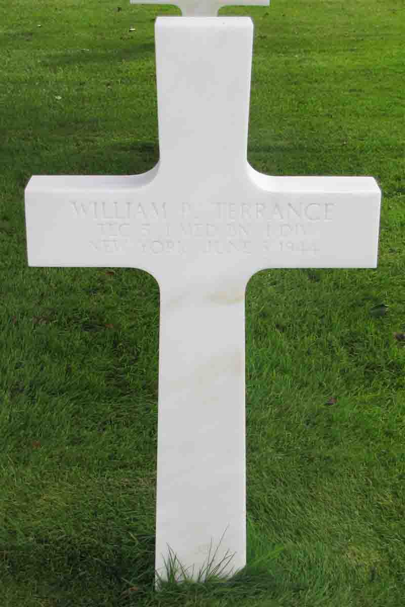 William P. Terrance was born in 1920 in New York. He served in the U.S. Army during World War II as a Technician Fifth Grade in the 1st Medical Battalion, 1st Infantry Division. He died on June 8, 1944 and is now buried in Normandy American Cemetery, Colleville-sur-Mer, France. His name is commemorated on the First Infantry monument in Omaha Beach, France and ranked as a Corporal.